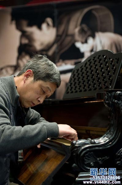 中国南京钢琴制作师张纲宁正在展会上调试钢琴