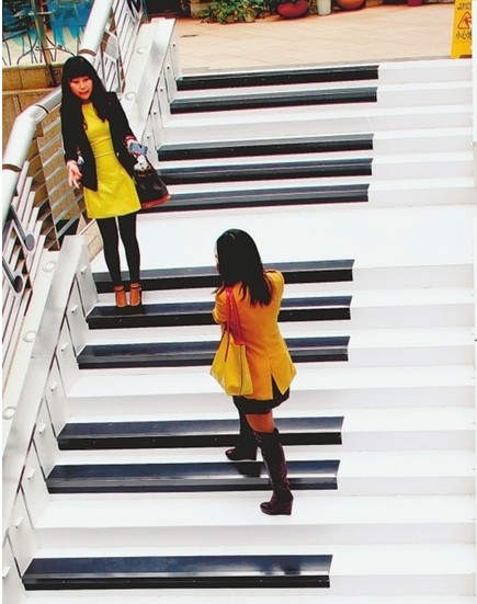 昨天下午,记者来到顺城购物中心,发现顺城购物中心只有一处二至三楼的楼梯改装成了钢琴楼梯,每个台阶都被贴成黑色或白色的琴键,两边贴着音符键。据附近商户说,这楼梯在国庆前已经开始使用,建成之后,走楼梯的市民增加不少。每个经过通道的行人都好奇地停下来看看钢琴楼梯,虽然楼梯旁就有电梯,但不少市民更愿意选择尝鲜。