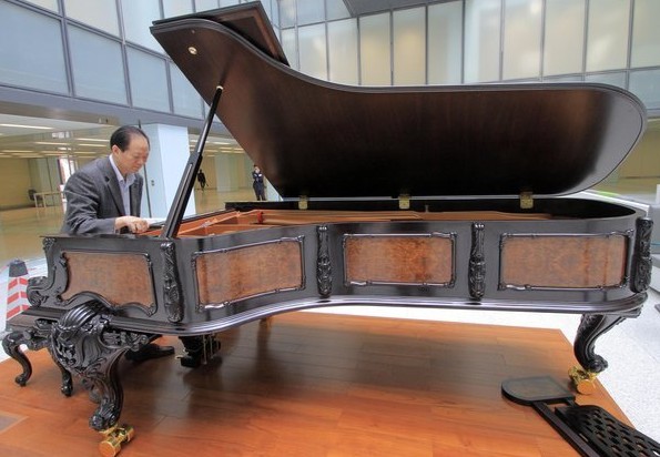 据介绍,这架全手工檀木九尺三角演奏钢琴是由制琴师张钢宁领衔手工制作,曾在鼓楼医院工作过的张钢宁无偿将这架价值700万的钢琴借给医院使用,希望用音乐缓解前来就诊病人的痛苦,调节氛围。