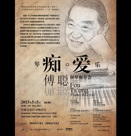 时隔一年,79岁高龄的傅聪再度来到广州星海音乐厅,将于2013年5月5日晚与广州的乐迷一起分享贝多芬、舒伯特、斯卡拉蒂、彪德西等名家的作品。