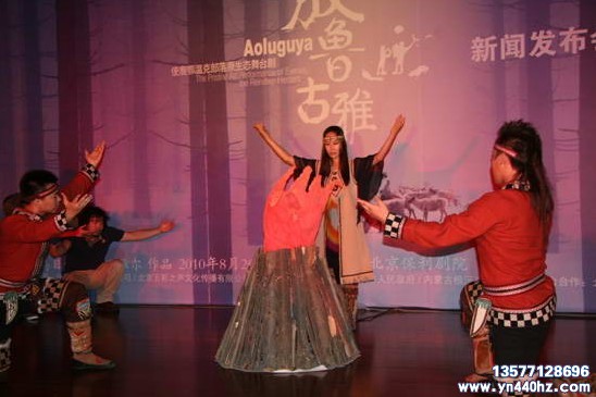 整场发布会在主办方营造的神秘原始的氛围中徐徐拉开帷幕,原生态歌手琪琪格玛开场在灯光的照耀下缓缓走出舞台中央的“撮罗子”,演唱潺潺如泉水般的《敖鲁古雅》主题曲《东泉》即刻便吸引了大家的目光。
