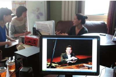 6月27日,杨彬在家中接受本报记者专访,电脑屏幕上是吴龙的演出照。本报记者摄